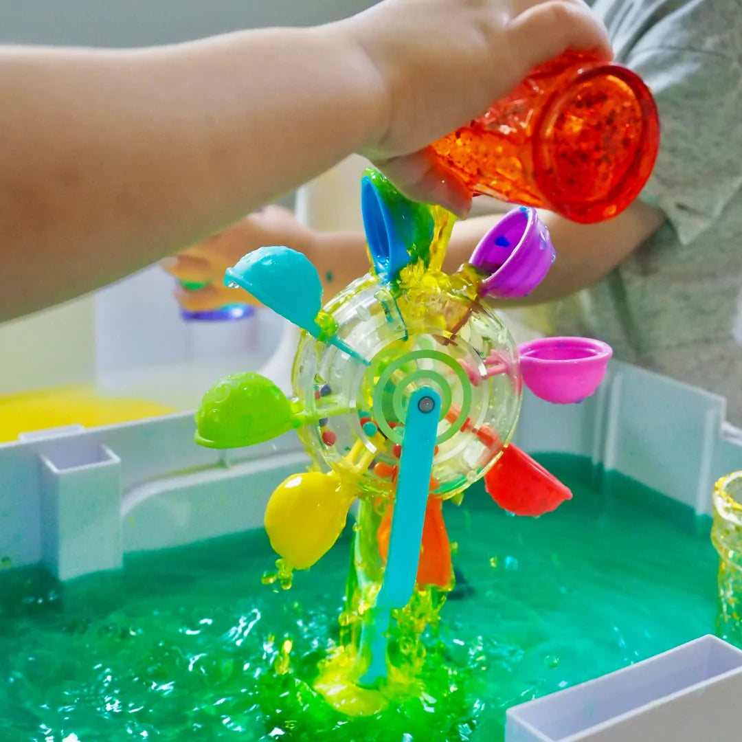 Los suaves cuencos de colores se mueven al verter agua, enseñándole conceptos de movimiento y reacción.