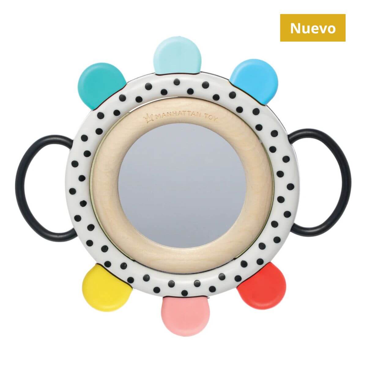 El atractivo espejo mordedor Wimmer cuenta con un espejo redondo seguro para bebés, rodeado de un aro de madera natural con asas de plástico resistente, coloridos botones de plástico suave para la dentición y un centro con un dibujo de diana.