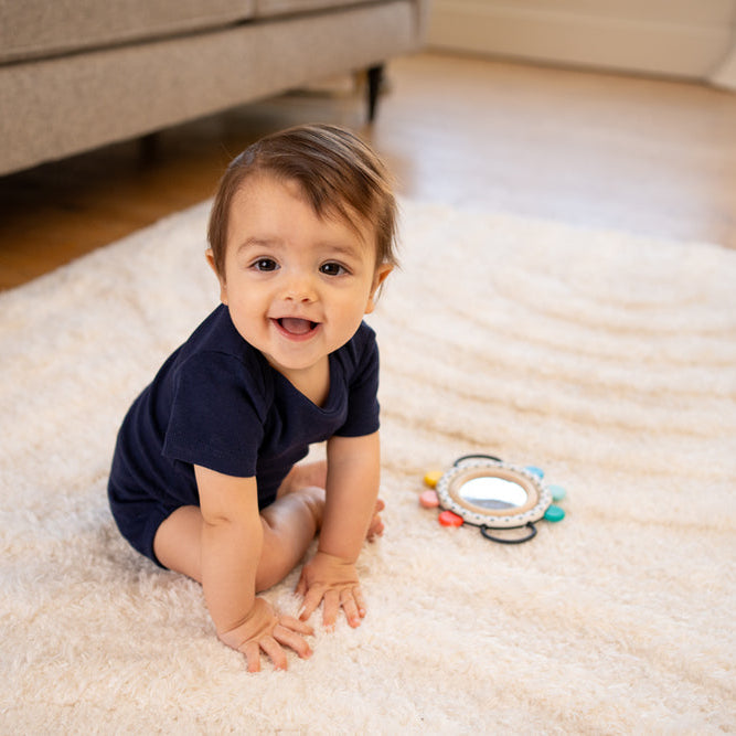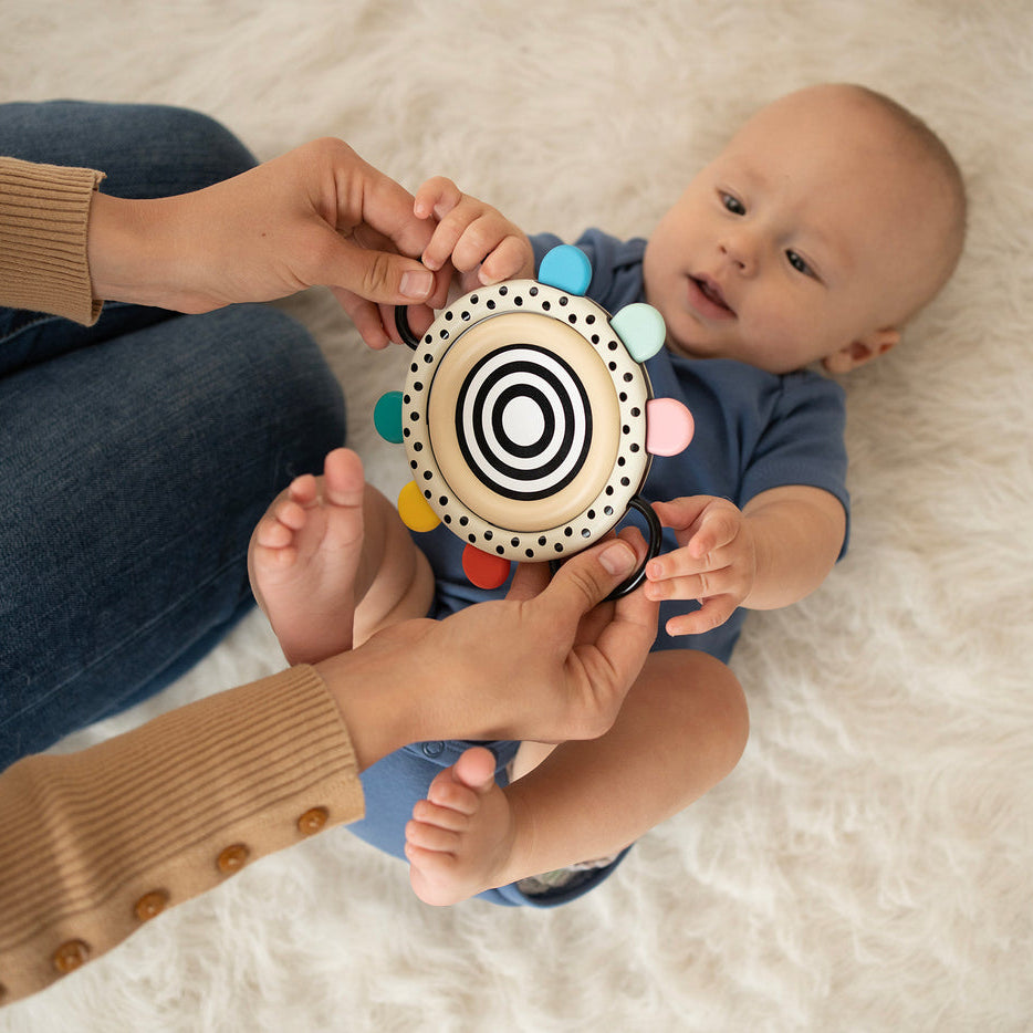 Capta la atención del bebé jugando con el espejo y la divertida diana en blanco y negro.