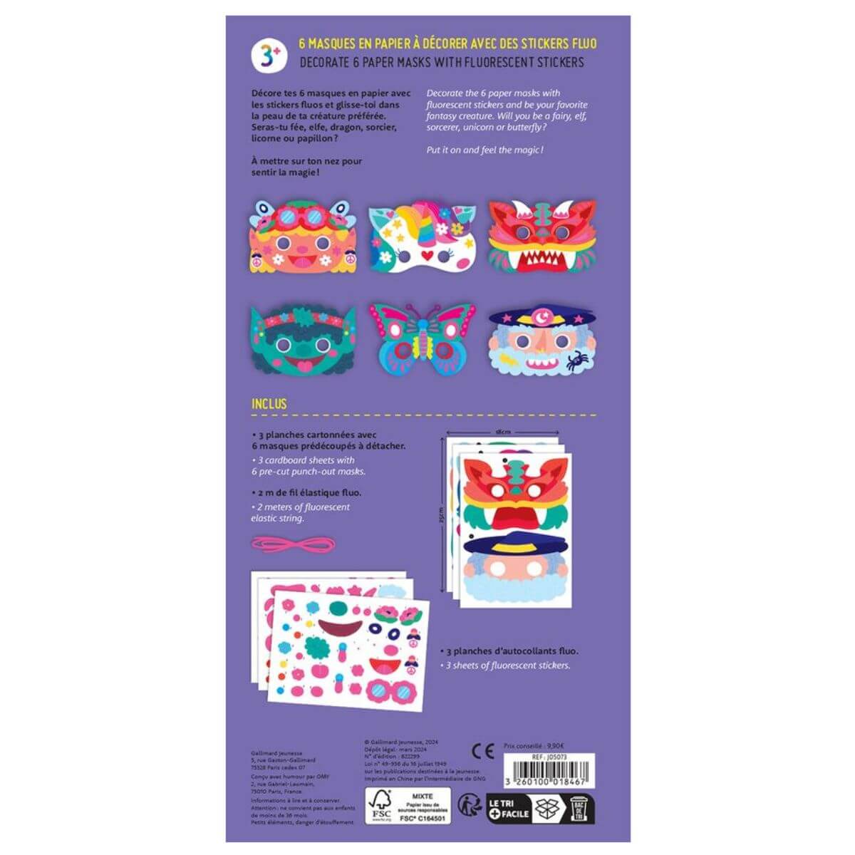 Decora las 6 máscaras de papel con las pegatinas neón y conviértete en tu personaje favorito.