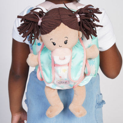Lleva tu muñeca Love Stella favorita para jugar en cualquier lugar con esta adorable mochila portabebés con cierres de velcro.