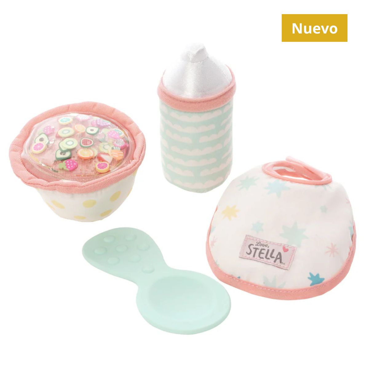 El set incluye un babero de tela, un tazón de comida, un biberón magnético y una cuchara de plástico.